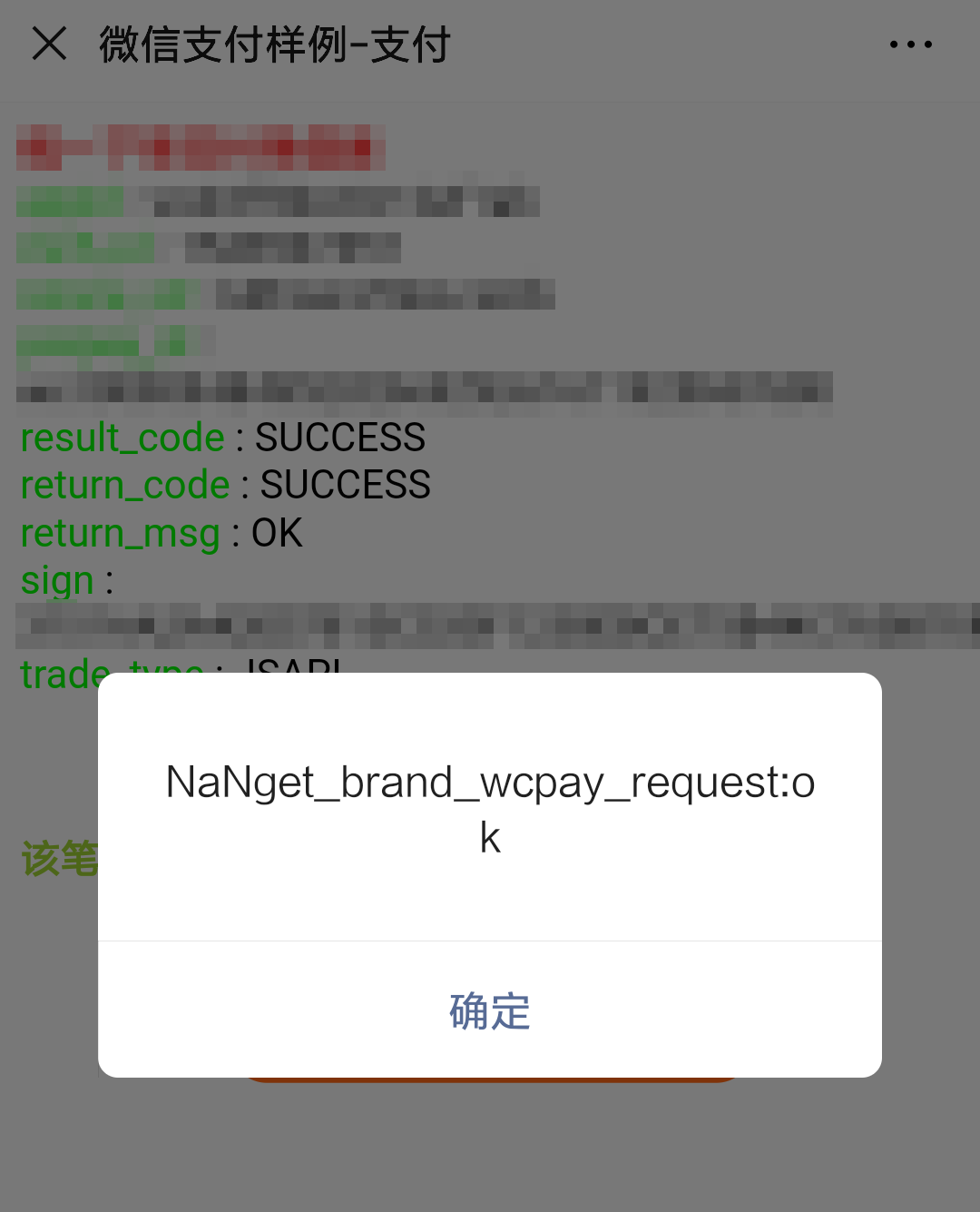 如果点的快,就会先拉起支付界面,等支付完成返回刚才页面的时候,才会看到弹出的”NaN:undefined”,等点击确定该弹窗消失后,才会进行设定的支付成功后的php操作,如跳转、输出等。